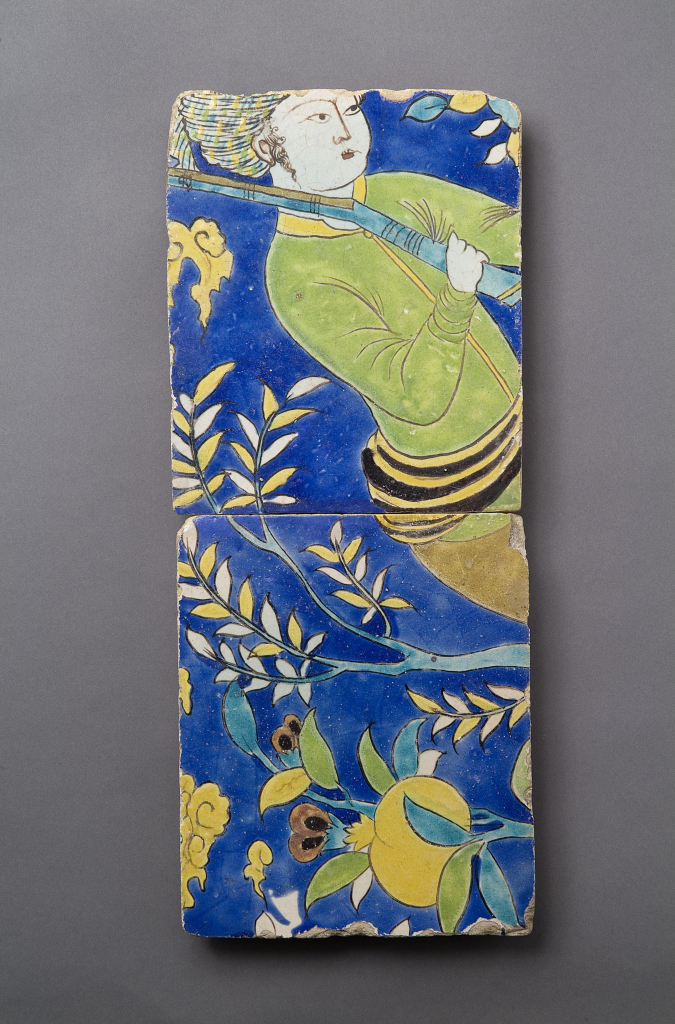 This elegant young man carrying an arquebus on his shoulder seems to have stepped straight out of Persian “Rezâ-e Abbâssî” miniature. His pensive face with its delicate features is topped with large turban and his green caftan is tied with a wide black and yellow belt. He passes nonchalantly in front of a tree whose fragile branches seem to wish to embrace him. One of the branches weighed down by a ripe pomegranate, bends under a sky of stylised yellow clouds. He holds the butt of his weapon lightly, the barrel resting on his shoulder. The arquebus was used in Europe by a number of regiments as early as the beginning of the 16th century, and was then gradually replaced by the musket and the rifle. The use of firearms was introduced to the East from the 16th century onwards, as illustrated in several miniatures. One of the oldest representations of a flint rifle in Iran is shown on a page of the famous ‘Shahnameh de Shah Tahmasp’, undertaken around 1530-35. Another rifle used during a royal hunt is painted on a miniature of Jami’s ‘Silsilat al-Dhahab’ copied in 1549 (New York 2003, fig 4.12 and fig 4.26 b). Their use became widespread in Iran from 1560 onwards, and they are sometimes represented on 17th century wall panelling (Christie’s 2004, lot n° 98).